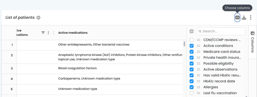 By scrolling to the right-hand side of the patient list, you will see an option to "Choose columns" this is where you can customise what columns you do and do not want included in the list for your patients.