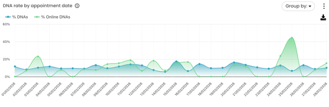 Use this to identify spikes or patterns over time, and to see whether your online booking did not attend rate is tracking differently to your overall did not attend rate.