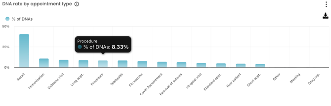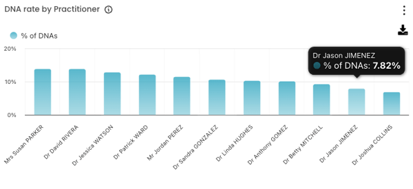 This figure shows the percentage of missed appointments per practitioner during the selected period. Hover over each column to see the DNA percentage.