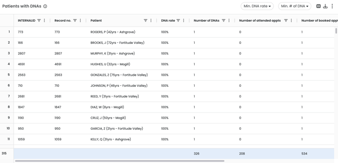 This table gives you a patient-level view of no-shows for the selected period, including each patient's did not attend rate, number of missed and attended appointments, and upcoming bookings. Use the filters at the top to focus on patients with a high DNA rate or a high number of missed appointments then use that list to prioritise your follow-up outreach.