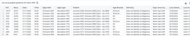 This table shows a list of patients who are potentially eligible for item 699 (and non-VR item 177).