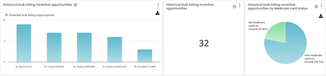 Use the "Trend of historical bulk billing incentive opportunities" graph to identify days/weeks/months where historical bulk billing incentive opportunities have been missed.