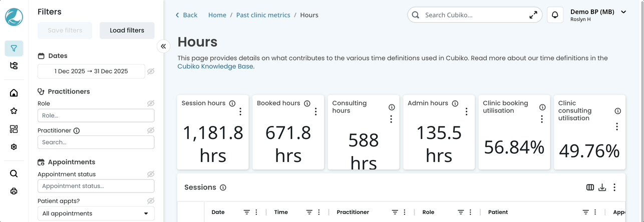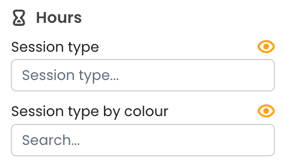 Hours filter – Use this drop-down filter to choose to filter by booked hour, consulting hour, or session hour, or by session colour. |
