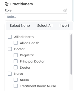 Select Role – You can filter by role e.g. doctor, nurse, specialist, or allied health. Simply click on Select Role, click on the role(s) that you want to filter by, and the metric data will change to show the chosen role's data. |