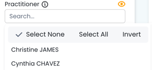 Select Practitioner – click on each name to select whom you want to look at. Individual Practitioners can be found by typing their name in the search field or hovering over the names in the drop-down list. A scroll bar will appear or search for a specific Practitioner. Once you have found the Practitioner, click on their name. Chosen Practitioner(s) will be highlighted and the metrics will show the data for only the chosen Practitioner(s). |