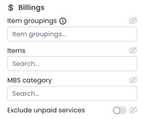 Select Items, groupings, and categories– This filter lets you filter by billing items. Simply click on the item numbers to review. The metric will then display the data for the item number(s) chosen. Item numbers to choose from can be found by typing in the search field or hovering over the item numbers and using the scroll-down bar. |
