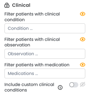 Clinical filters - Available on metrics showing clinical data. Filter by Condition, Observation, or Medication. See more info on our Patient cohort explorer here. |
