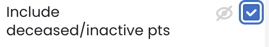 | Include deceased/inactive patients - Select this filter to include patients that are marked as deceased/inactive (which are otherwise not included) in the metrics where this filter is available. | |