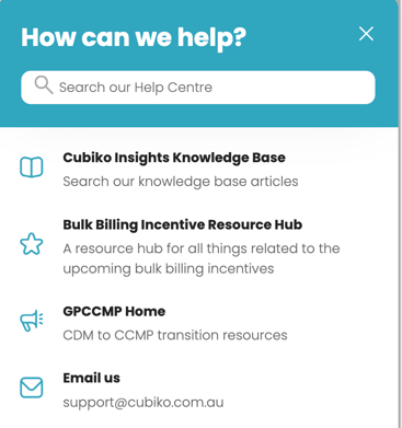 | Need Help? Use our Need Help button on the bottom right-hand side of your screen for quick access to our Help Centre, Knowledge Base, resources, Cubiko Learning Hub, online courses and upcoming webinars. |