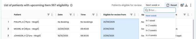 Filter patients eligible for item 965 review up to 4 weeks in advance, using the table customisation! Head to Item 967, scroll down to the second table for some key filtering options!