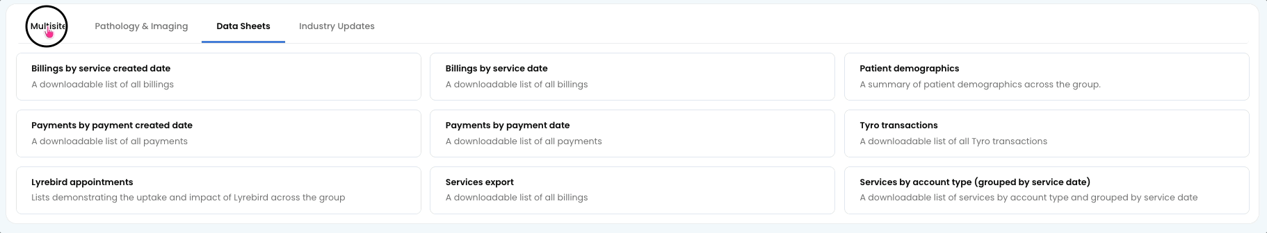 - Data Sheets — downloadable data exports for billing, payments, patient demographics, Tyro transactions, Lyrebird appointments, services, and more