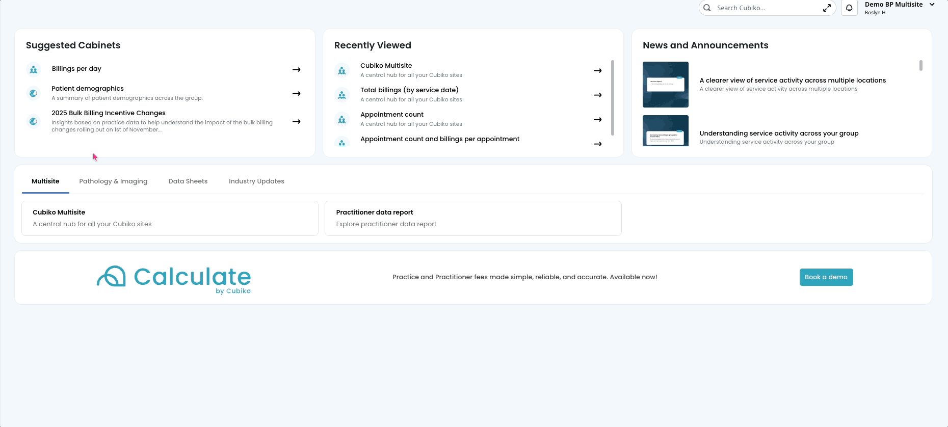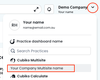 To access Multisite, select your practice name in the top right corner of Cubiko and choose your Multisite dashboard from the list.