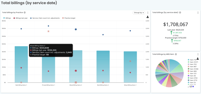 A high-level snapshot of financial performance across the group. See metrics including Total billings, Payments, Bulk billing and Private billing percentages, CDM and CCMP billings and opportunities, Appointment counts & billings per appointment, and Billings and appointments per hour — all in one dashboard view. Click through each of these metrics to see a breakdown of the data for each metric.