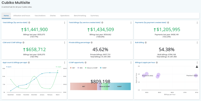 The Cubiko Multisite dashboard is the main hub for group-wide performance reporting. It contains a series of inner tabs, each focused on a different area of your practices.