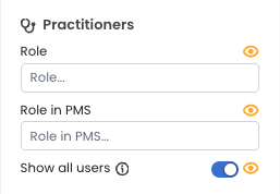 - Practitioner filters — filter by Role, Role in PMS, or show all users