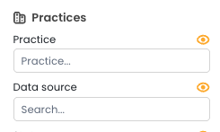 - Practices — Practice: filter to one or more specific practices within your group. Data source: filter by the practice management system (PMS) data source