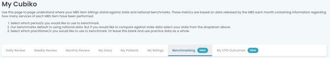 - Benchmarking - Use this page to understand where your MBS item billings stand against state and national benchmarking.