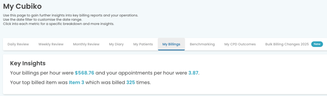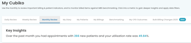 - Monthly review - Use the monthly to review important billing & and patient indicators, and to monitor billed items against MBS benchmarking.