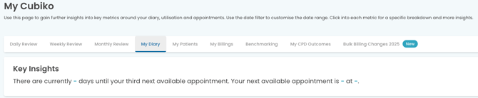 - My Diary - Use this page to gain further insights into key metrics around your diary, utilisation and appointments.