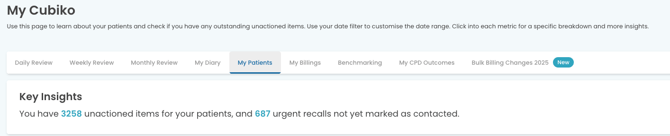Use this page to learn about your patients and check if you have any outstanding unactioned items and urgent recalls. Use your date filter to customise the date range. Click into each metric for a specific breakdown and more insights.