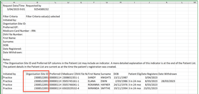 The CSV you export from PRODA will include the practice's MyMedicare Site ID (this will be the 2nd column listed "Organisation Site ID").