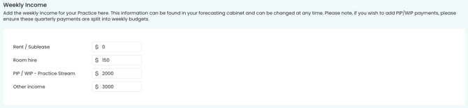TOP TIP! Use your practices P&L accounting statement, or speak with your bookkeeper/accountant to discuss the weekly costs/expenses and income for your practice. This information will help you provide accurate data to use in Cubiko.