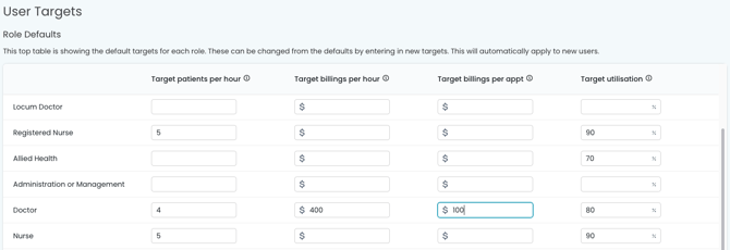 By adding role based targets in this top table it will apply these targets to the individuals with that role type by default. They can be adjusted in the table underneath for individuals who may have a variation.