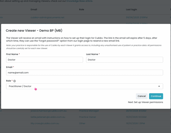 8. Create new Viewer: Once complete, select "Create new Viewer" to save this profile. An automated email will be sent to the email address supplied for the GP to set up their password and 2FA. 1. Check Junk/Spam 2. Check the spelling of the email is correct. More info here: Guide to logging into Cubiko