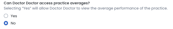 6. Can the doctor access practice averages: This section controls whether the viewer can see the average performance of the practice (e.g. average billings per hour) on the My Cubiko page. You may not always feel it is appropriate for a Practitioner to see the average of your practice’s metrics and measures. E.g. in the case of Locums or Registrars. If you select ‘Yes’ here, any other Practitioners’ data will be anonymised. |