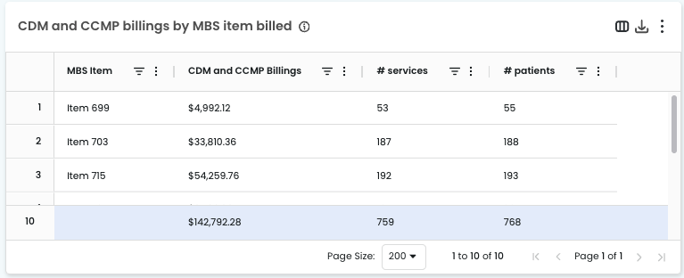 The CDM and CCMP billings by MBS item billed table lists the total billings broken down by the MBS item billed. This is particularly useful if you are keeping track of monthly targets for certain services.