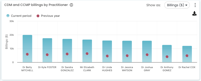 This chart shows practice chronic condition management (CDM/CCM) billings (inclusive of GST, and based on service date) per Practitioner for the selected time period.