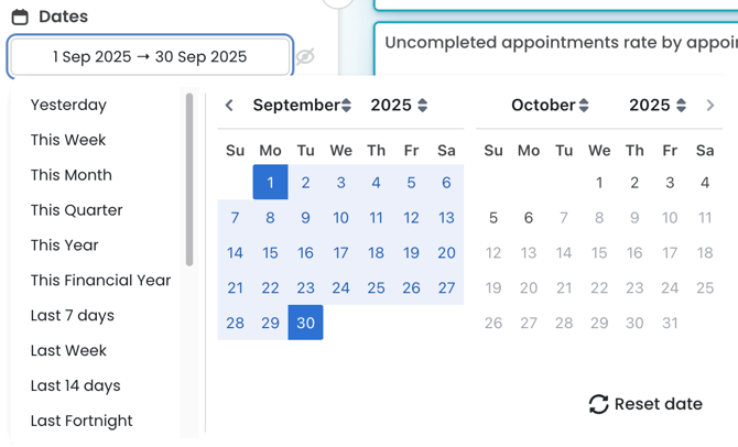 TOP TIP! Don't forget to adjust your date filters to view a more extensive overview of your uncompleted appointment rate by appointment date! Select one of the shortcuts, or set a custom date range!